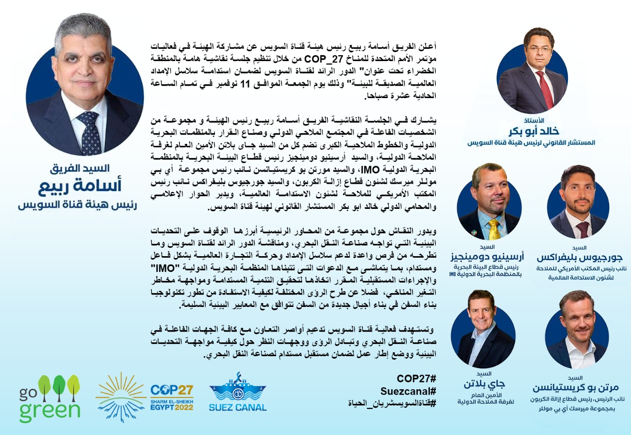ويشارك في الجلسة النقاشية الفريق أسامة ربيع، رئيس الهيئة، ومجموعة من الشخصيات الفاعلة في المجتمع الملاحي الدولي، وصناع القرار بالمنظمات البحرية الدولية والخطوط الملاحية الكبرى، تضم كلًا من جاي بلاتن الأمين العام لغرفة الملاحة الدولية، وأرسينيو دومينجيز رئيس قطاع البيئة البحرية بالمنظمة البحرية الدولية IMO، ومورتن بو كريستيانسن نائب رئيس مجموعة أي بي موللر ميرسك لشئون قطاع إزالة الكربون، وجورجيوس بليفراكس نائب رئيس المكتب الأمريكي للملاحة لشئون الاستدامة العالمية، ويدير الحوار الإعلامي والمحامي الدولي خالد أبو بكر المستشار القانوني لهيئة قناة السويس.