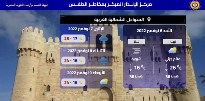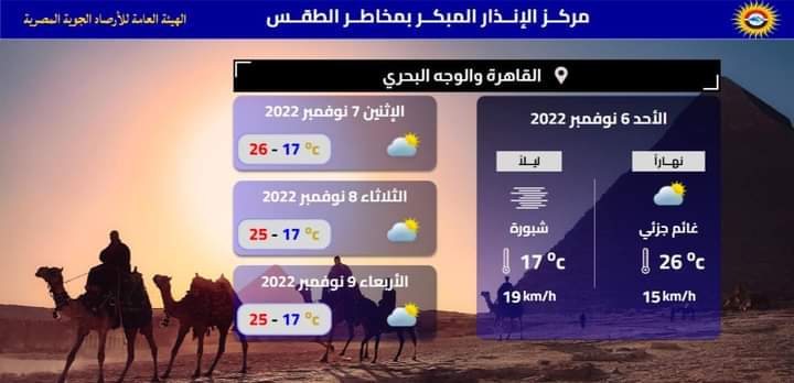 وأوضحت الهيئة العامة للأرصاد، أن القاهرة والوجه البحري اليوم الأحد، الموافق 6 نوفمبر 2022، سجلوا 26 درجة نهارًا مع غيوم جزئية، في حين تظهر الشبورة ليلًا مع درجة حرارة تصل إلى 17.