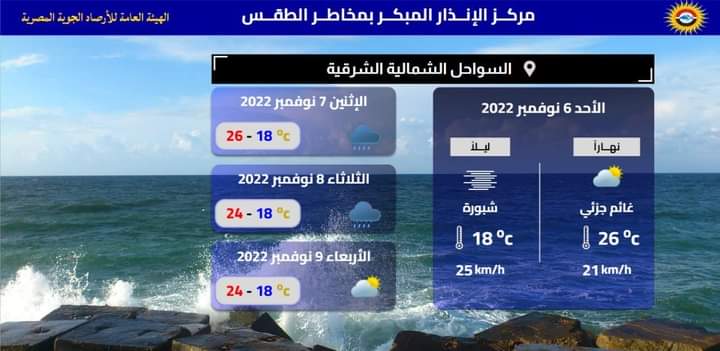 وتتوقع هيئة الأرصاد الجوية أن تسجل السواحل الشمالية الشرقية 26 درجة خلال فترات النهار، و18 درجة ليلًا، وذلك خلال اليوم الأحد، وتكون الحرارة المتوقعة 26-18 يوم الاثنين، أما يومي الثلاثاء والأربعاء فتصل الحرارة إلى 24-18.
