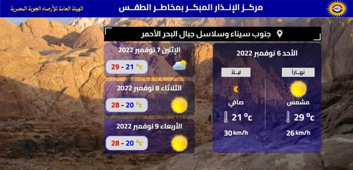 وتسود مناطق جنوب سيناء وسلاسل جبال البحر الأحمر؛ أجواءً مُشمسة نهارًا مُسجلة 29 درجة، وتكون الأجواء صافية ليلا بحرارة 21 درجة، وذلك خلال يومي الأحد والاثنين.