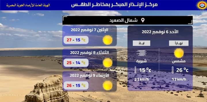 وأفادت هيئة الأرصاد الجوية، بأن مناطق شمال الصعيد ستسجل اليوم الأحد 26 درجة، لتسود بذلك أجواءً مُشمسة، بينما تكون درجات الحرارة ليلا 15 درجة، مع ظهور الشبورة.