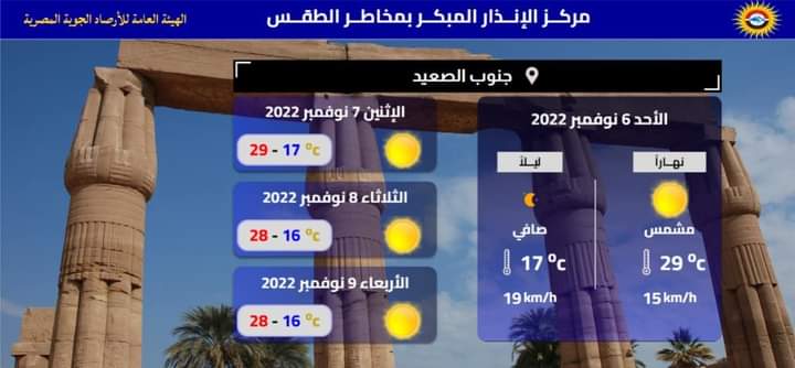 وكشفت هيئة الأرصاد الجوية؛ توقعاتها حول درجات الحرارة على مناطق جنوب الصعيد، حيث تسجل اليوم الأحد 29 و17 درجة، وبالمثل تكون يوم الاثنين، أما الثلاثاء والأربعاء فتنخفض الحرارة بشكل طفيف لتسجل 28 و16 درجة.