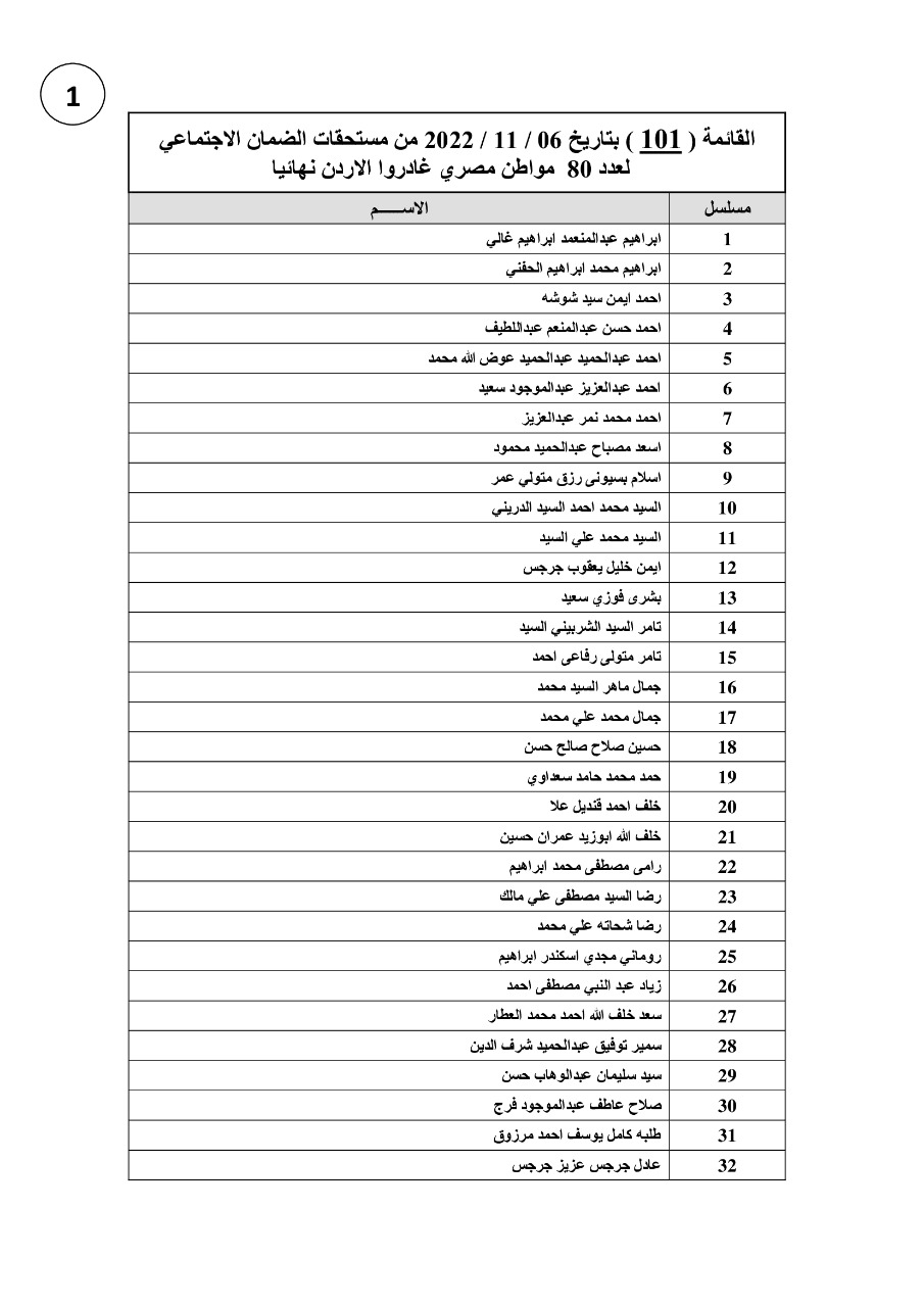 وأوضح الملحق العمالي، أنه طبقًا لإجراءات المؤسسة العامة للضمان الاجتماعي بالأردن؛ سيتم استرجاع المبالغ غير المصروفة بعد مرور 50 يومًا من تاريخ إعلان تحويل المُستحقات، مشيرًا إلى أنه يتم بشكل مُستمر؛ التنسيق والتجهيز لإرسال باقي الدفعات لمستحقيها تباعًا، فور تدقيقها من الجهات المعنية حفاظًا على حقوق المواطنين المستحقين لهذه الدفعات، وتضم القائمة الجديدة الأسماء المرفقة مع هذا البيان: