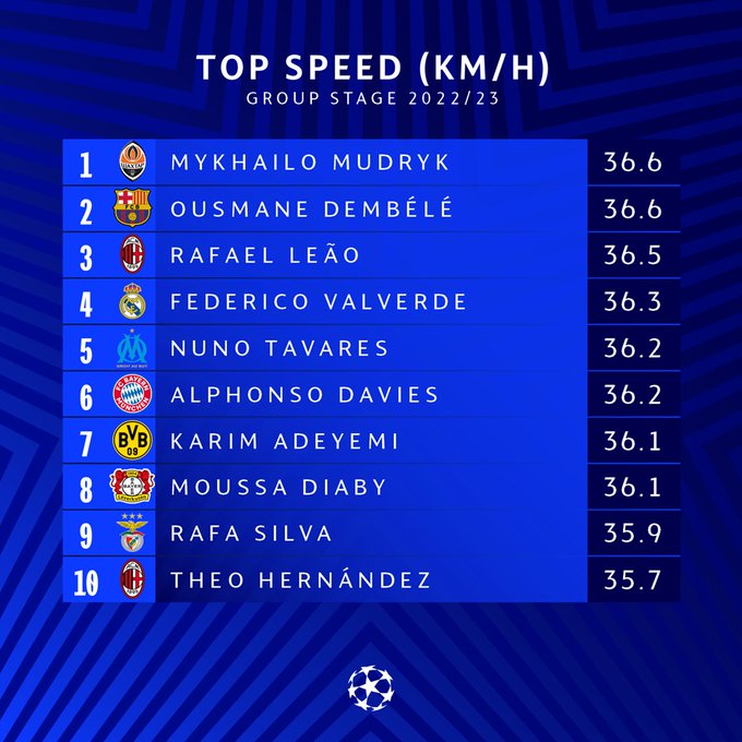 قائمة أسرع 10 لاعبين في بطولة دوري أبطال أوروبا 2022-2023