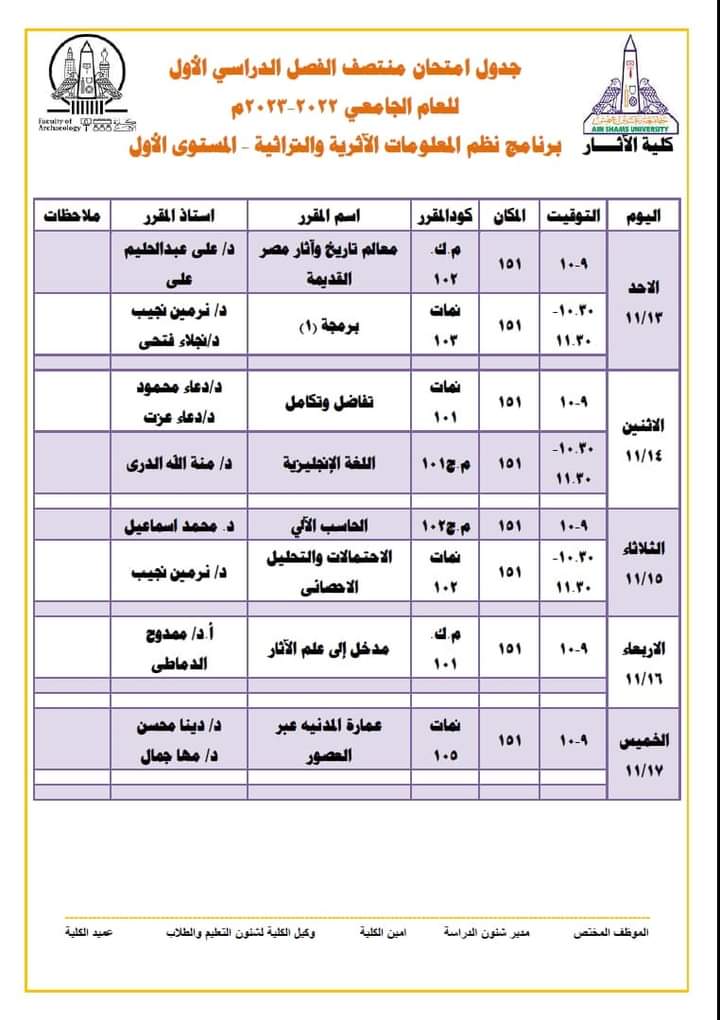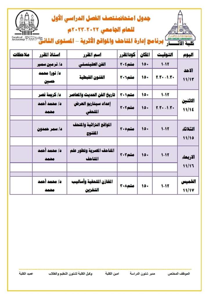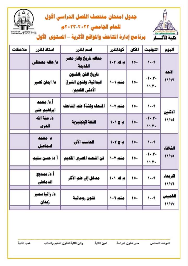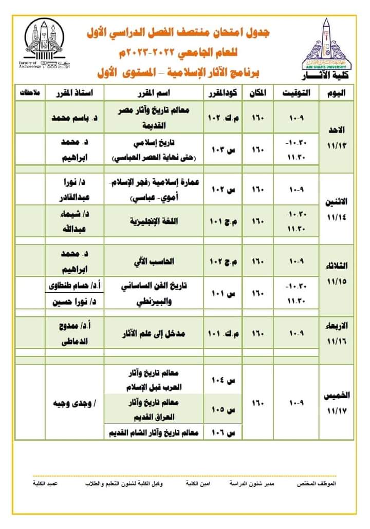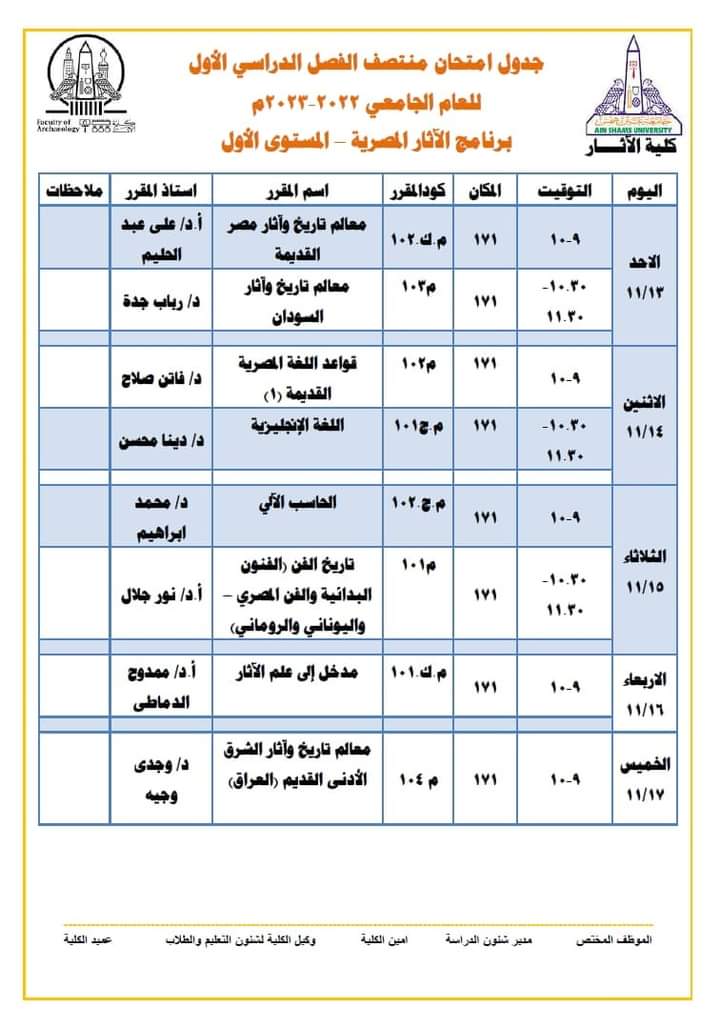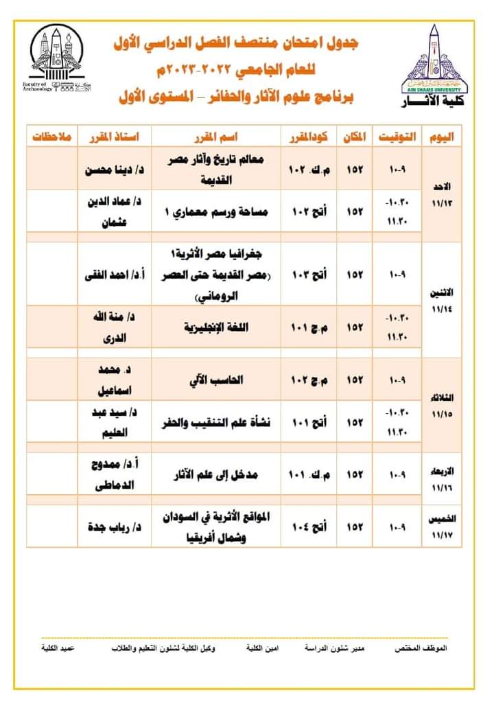 تستعد كلية الآثار بـ جامعة عين شمس لإجراء امتحانات منتصف الفصل الدراسي الأول للعام الدراسي الجامعي الجديد 2022-2023 لجميع برامج الكلية، وذلك تطبيقًا لما ورد في مواد اللائحة الداخلية للكلية التي تنص المادة 14 منها على عقد هذا الاختبار خلال الأسبوع السابع من الدراسة على أن يُخصص له 10 درجات.