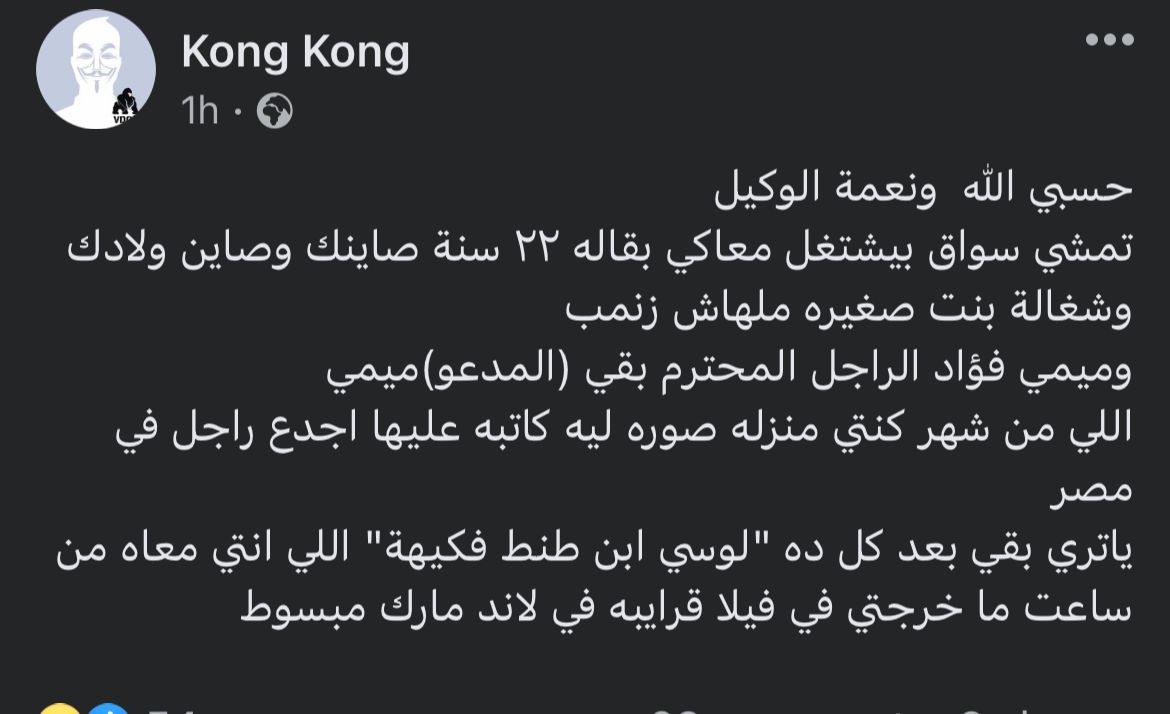 وكتب محمد عبد الوهاب، منشورًا عبر حسابه الشخصي بموقع التواصل الاجتماعي فيسبوك، وقال: حسبي الله ونعمة الوكيل.. تمشي سواق بيشتغل معاكي بقاله 22 سنة صاينك وصاين ولادك وشغالة بنت صغيره ملهاش زنب.. وميمي فؤاد الراجل المحترم بقى اللي من شهر كنتي منزله صورة ليه كاتبة عليها.. أجدع راجل في مصر.