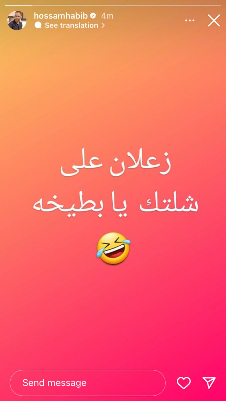 وكتب حسام حبيب عبر خاصية ستوري بموقع تبادل الصور والفيديوهات انستجرام، قائلًا: زعلان على شيلتك يا بطيخ.