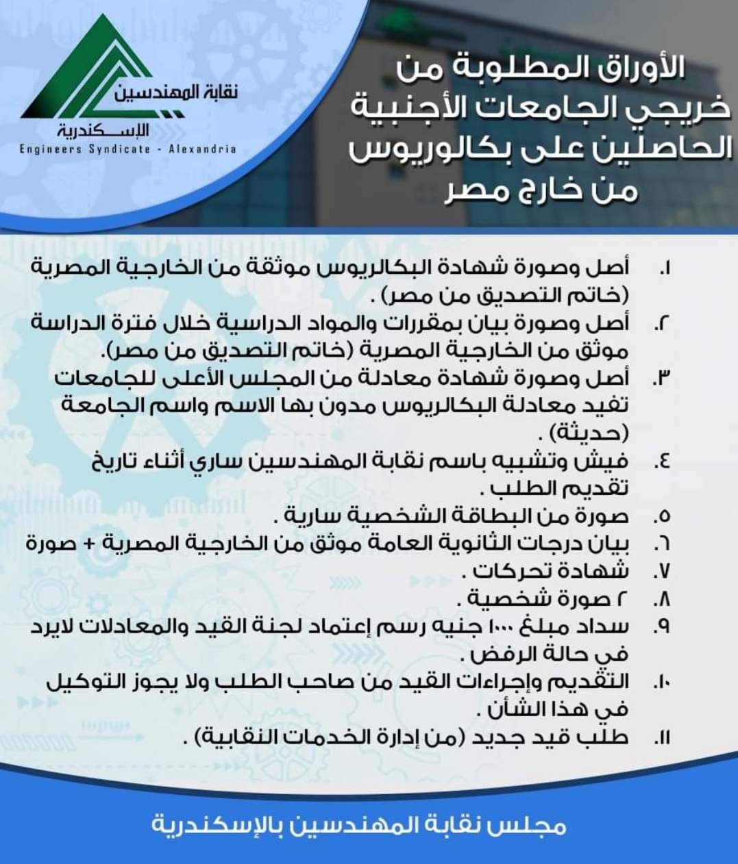 أعلن مجلس نقابة المهندسين بالإسكندرية عن الأوراق المطلوبة من خريجي الجامعات الأجنبية الحاصلين على بكالوريوس من خارج مصر.