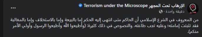 جاء ذلك خلال منشور لها عبر صفحة الإرهاب تحت المجهر، بموقع التواصل الاجتماعي فيسبوك، والتي أسستها دار الإفتاء، بهدف محاربة الأفكار المتطرفة والفكر الشاذ، وتبديد حجج الجماعات الإرهابية، حمايةً للأطفال والشباب من الاستقطاب الفكري الذي تماسره هذه الجماعات.