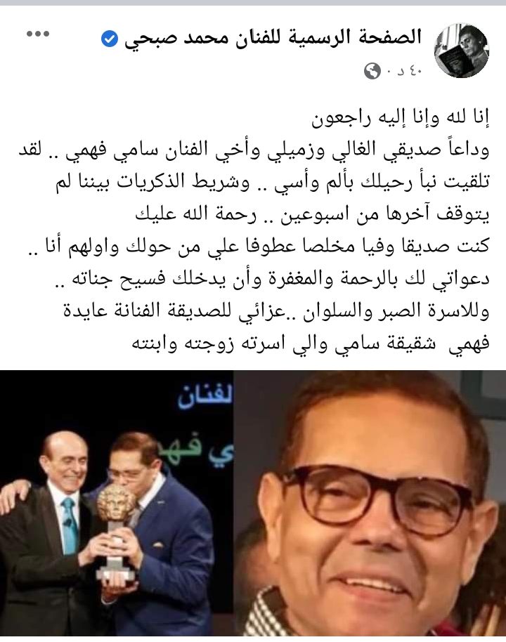ونشر محمد صبحي، صورة جمعته بـ سامي فهمي، عبر حسابه الشخصي بموقع فيسبوك، وعلق عليها قائلًا: إنا لله وإنا إليه راجعون.. وداعًا صديقي الغالي وزميلي وأخي الفنان سامي فهمي.