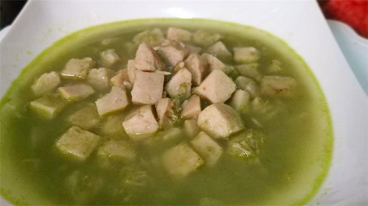 - نطحنهم جيدًا للحصول على عجينة ناعمة نخلطها مع مرق الدجاج والقلقاس بعد تمام نضجهم.