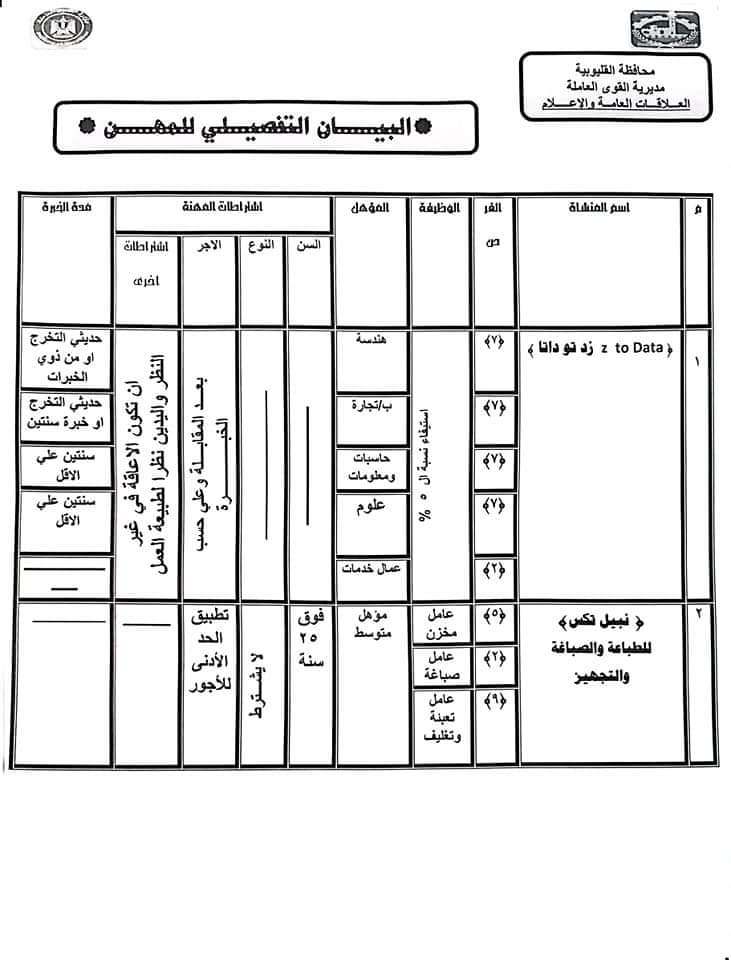 أعلنت مديرية القوى العاملة بمحافظة القليوبية، بقيادة إيمان شحاتة مدير المديرية، توفير 109 فرص عمل بالقطاع الخاص في العديد من التخصصات، برواتب مجزية، فضلًا عن توفير التأمين الصحي والاجتماعى، وذلك خلال شهر لعام 2022 م حتى اكتمال الأعداد المطلوبة من تلك المهن المعروضة.