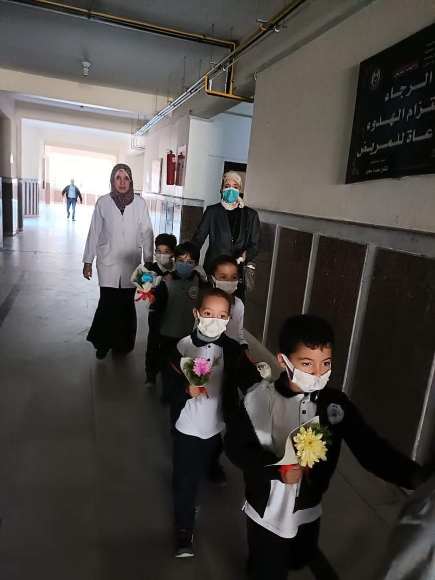 بالورود.. تلاميذ مدرسة بالنوبارية يزورون زميلهم المصاب في حادث حريق مصنع أكسجين بالبحيرة