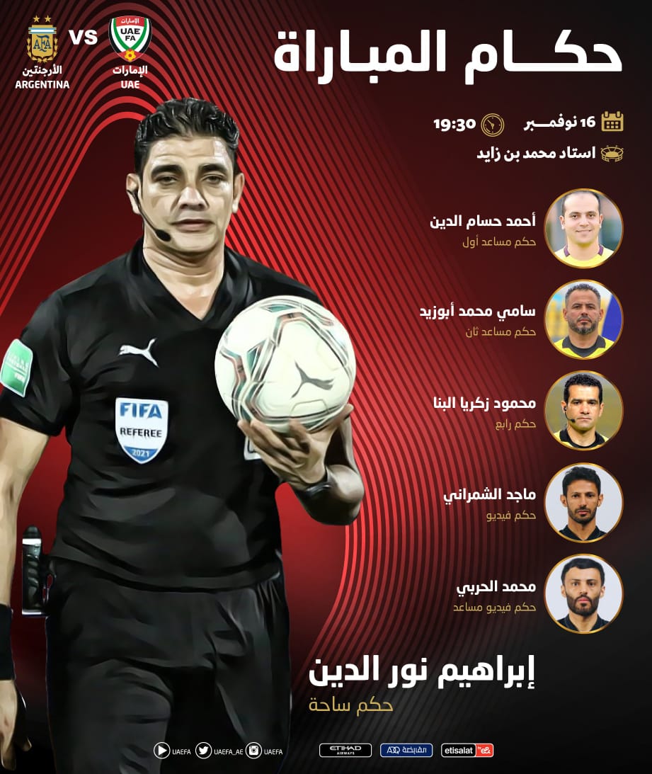 وسيكون طاقم تحكيم مباراة الأرجنتين والإمارات كالتالي:
