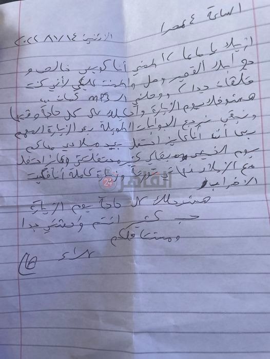وقال علاء عبد الفتاح في الجواب لوالدته: أنا من النهارده شربت مياه فإنتي تقدري تطمني تماما لحد ما تشوفيني بنفسك، والعلامات الحيوية النهاردة كويسة.