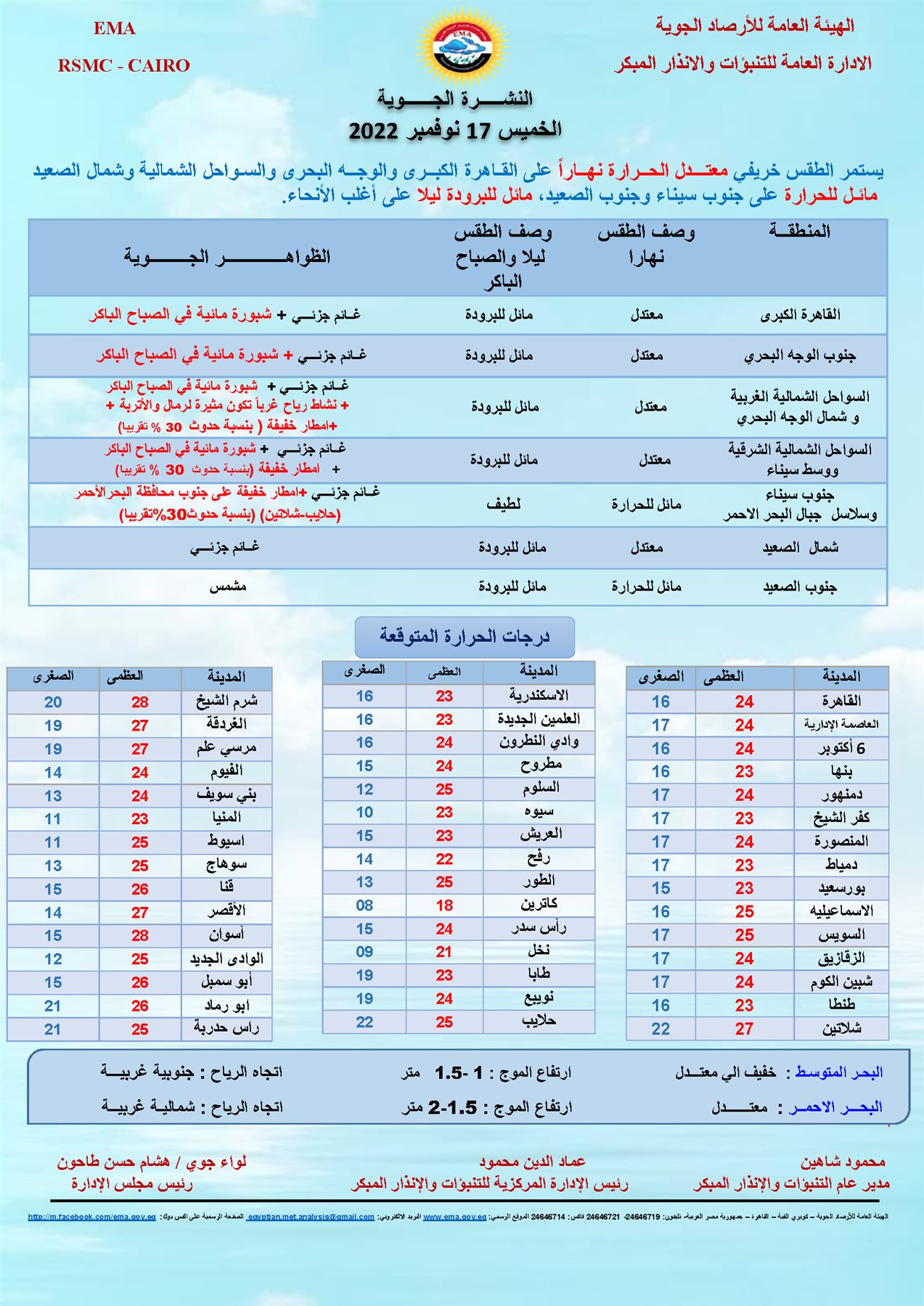 درجات الحرارة غدا الخميس 17 نوفمبر 2022