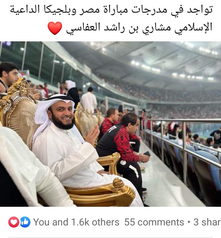 نشر الداعية الإسلامي مشاري راشد العفاسي صورة له من مدرجات مباراة مصر وبلجيكا التي أقيمت على أرضية ستاد جابر الأحمد في الكويت، وانتهت منذ قليل بهدفين مقابل هدف وحيد لصالح الفراعنة.