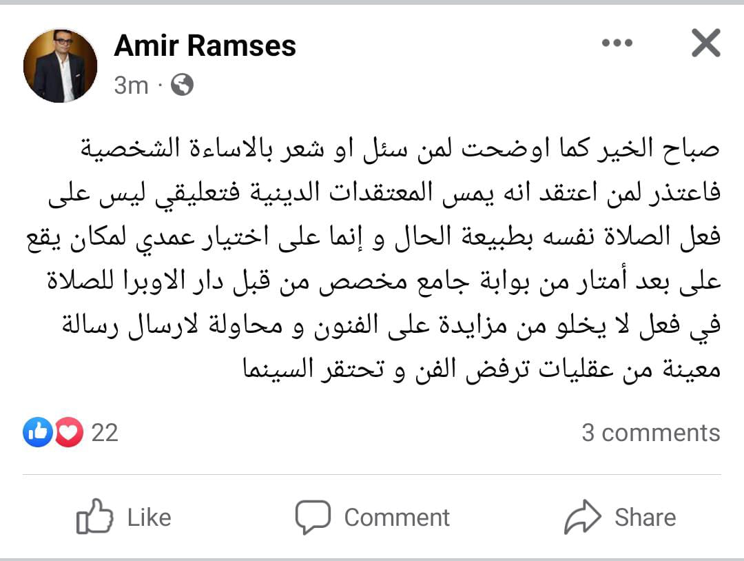 وأضاف أمير رمسيس: تعليقي ليس على فعل الصلاة نفسه بطبيعة الحال وإنما على اختيار عمدي لمكان يقع على بعد أمتار من بوابة جامع مخصص من قبل دار الأوبرا للصلاة في فعل لا يخلو من مزايدة على الفنون ومحاولة لإرسال رسالة معينة من عقليات ترفض الفن وتحتقر السينما.