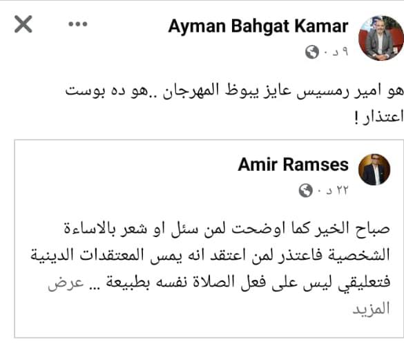 كما إعاد ايمن بهجت قمر، مشاركة منشور أمير رمسيس، عبر حسابه الشخصي بموقع فيسبوك، قائلًا: هو أمير رمسيس عايز يبوظ المهرجان، هو ده بوست اعتذار.