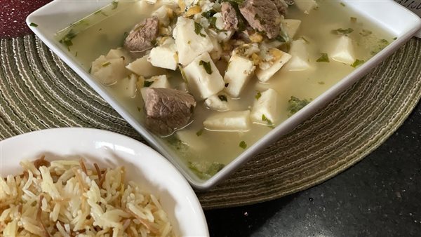 - بعد دخول اللحمة في مرحلة النضج سيتم إضافة مكعبات القلقاس ويترك لينضج داخل الشوربة مدة 20 دقيقة.
