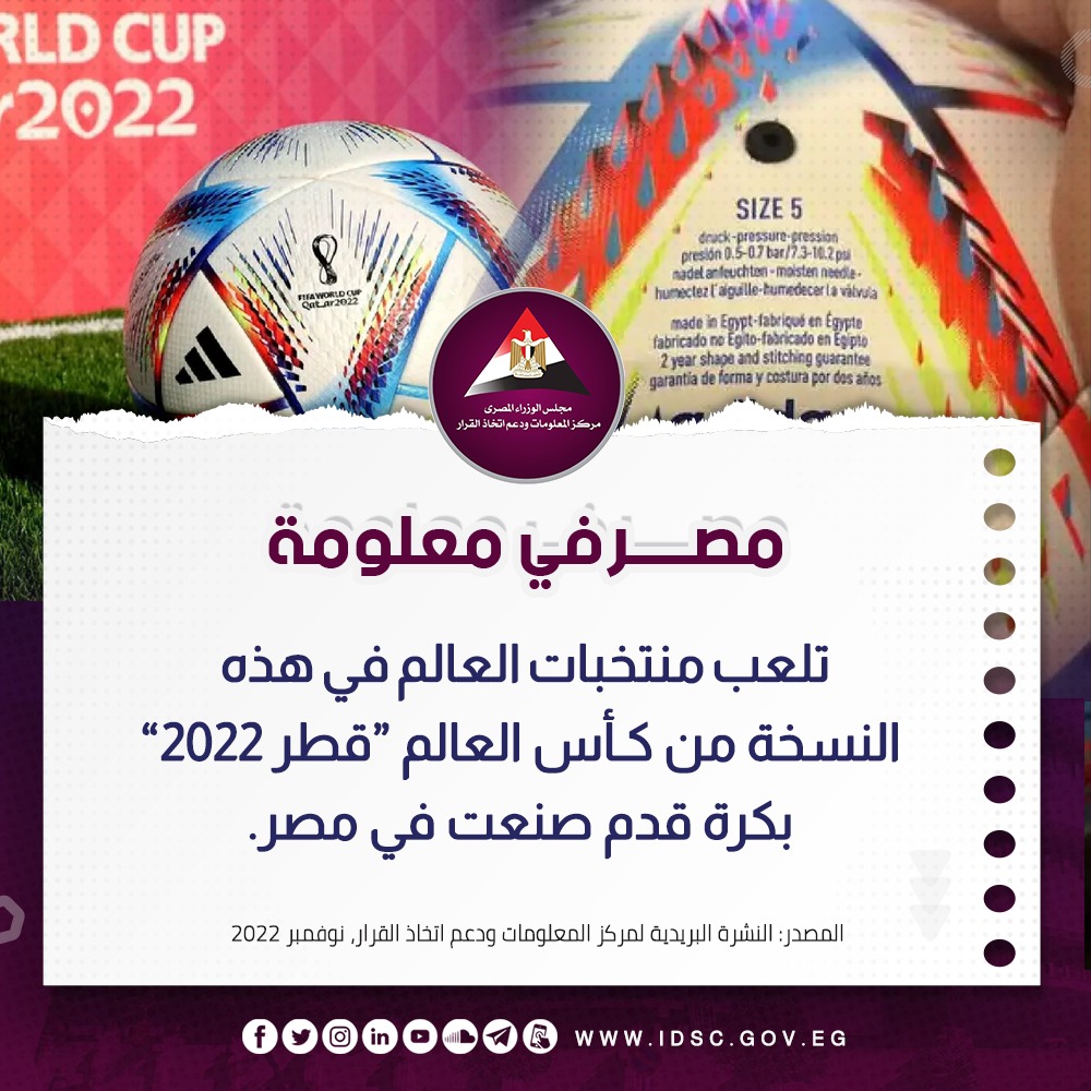 وتابع عبر انفوجراف مرفق بالمنشور: تلعب منتخبات العالم في هذه النسخة من كأس العالم قطر 2022 بكرة قدم صنعت في مصر.