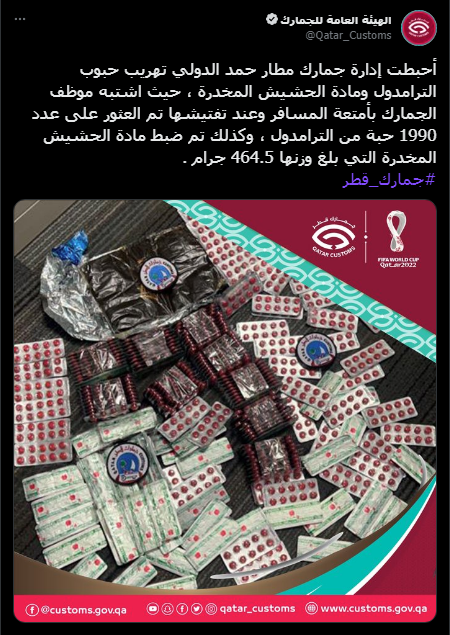 ونشرت الهيئة العامة للجمارك بقطر عبر حسابهم الرسمي على موقع التواصل الاجتماعي توتير، صورة لـ كمية المخدرات الكبيرة التي تم ضبطها، وعلقوا عليها: أحبطت إدارة جمارك مطار حمد الدولي تهريب حبوب الترامدول ومادة الحشيش المخدرة، حيث اشتبه موظف الجمارك بأمتعة المسافر وعند تفتيشها تم العثور على عدد 1990 حبة من الترامدول، وكذلك تم ضبط مادة الحشيش المخدرة التي بلغ وزنها 464.5 جرام.