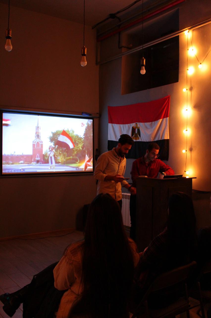 وأضاف أحد منظمي الأسبوع الثقافي المصري، وهو طالب مصري بروسيا، أن العرض تضمن أيضًا الحديث عن مساحة مصر وعدد سكانها، وأيضًا عدد الأجانب المقيمين في مصر وبالأخص الروسيين المقيمين هنا، وكذلك الديانات ونهر النيل كأطول أنهار العالم، ثم فيديوهات عن أجمل الأماكن في مصر والقاهرة على موسيقى النشيد الوطني.