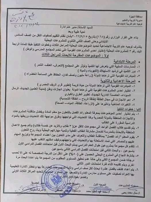 وقالت المديرية في خطابها، إنه بناء على القرار الوزاري رقم 168 بشأن نظام التقييم لصفوف النقل من الصف السادس الابتدائي حتى الصف الثاني الثانوي للمشروعات البحثية، حدد توجيه عام التربية الاجتماعية الموضوعات البحثية للمراحل الـ 3 وخطوات التنفيذ طبقا للمادة الرابعة، البند رقم 3 للمشروعات البحثية، اختيار إحدى المشروعات القومية التي تخدم المجتمع المدرسي والوطن.
