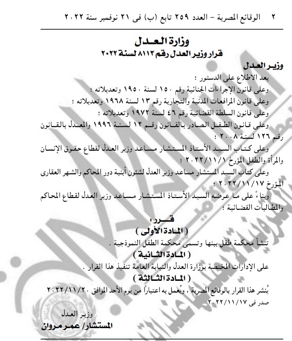 نشرت جريدة الوقائع المصرية في العدد الصادر برقم 259 تابع (ب) في21 نوفمبر لسنة 2022، قرار المستشار عمر مروان وزير العدل، بإنشاء محكمة طفل ببنها، وتسمى محكمة الطفل النموذجية.