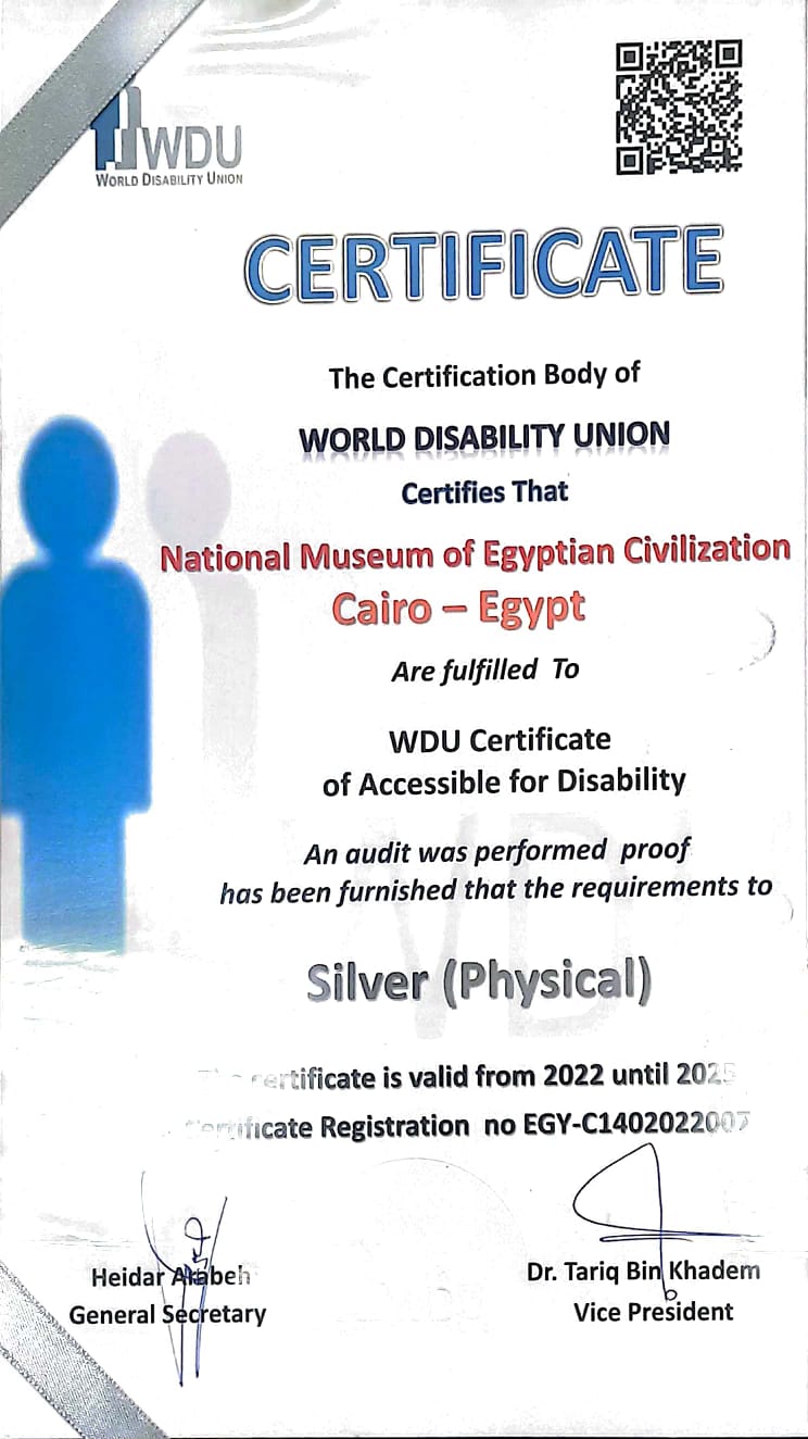 يذكر أن الاتحاد العالمي لذوي الإعاقة، هو منظمة تم إنشائها عام 2011، وتضم 400 منظمة في 91 دولة، ليصبح المتحف القومي للحضارة المصرية بالفسطاط؛ أول متحف يحصل على هذه الشهادة، وتُمنح لمدة 3 سنوات، وتعطي الفرصة ليكون هناك استدامة للخدمات والإتاحة، وهو ما يتطابق مع رُؤى المتحف وأهدافه.