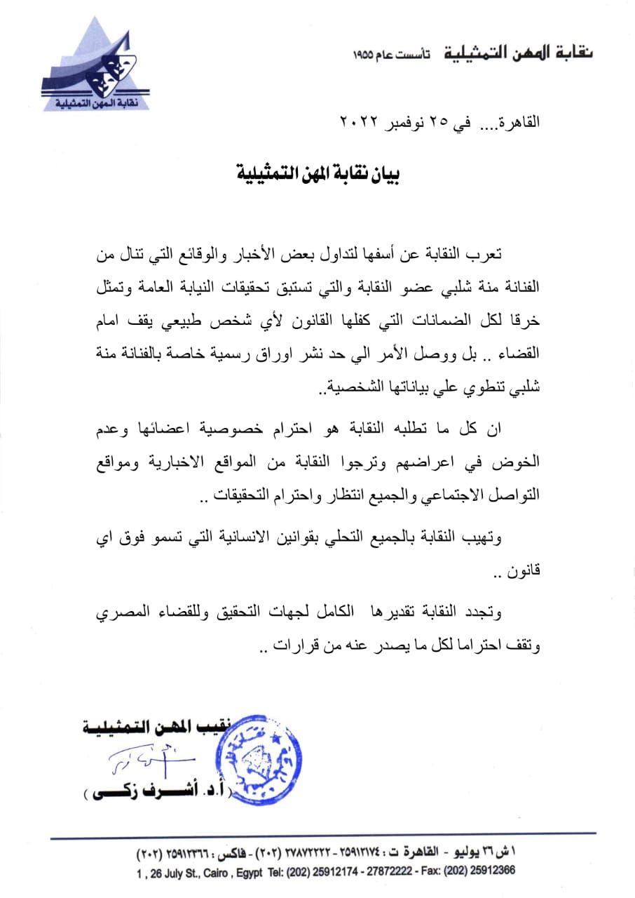 وأعربت النقابة عن أسفها لتداول ونشر أوراق رسمية خاصة بالفنانة منة شلبي تنطوي علي بياناتها الشخصية.