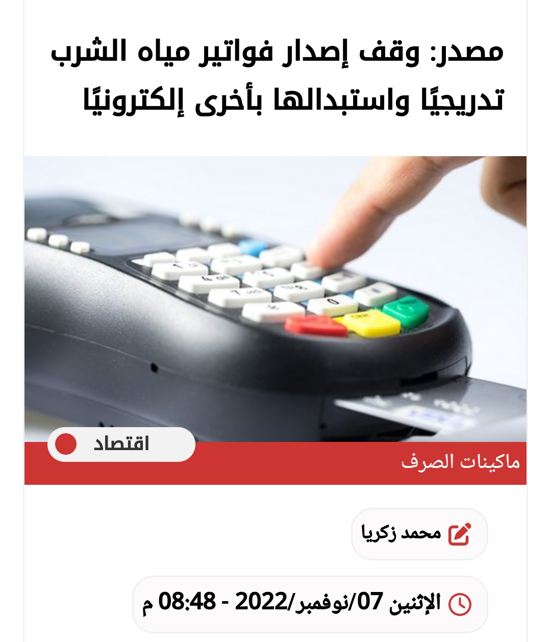 وكان القاهرة 24، نشر مطلع الشهر الجاري، خبرًا يفيد باعتزام الشركة القابضة لمياه الشرب والصرف الصحي، وقف إصدار وطباعة إيصالات مياه الشرب المعتادة تدريجيًا، والعمل على تحصيل الفواتير عن طريق ماكينات حديثة تصدر الفواتير إلكترونيًا.