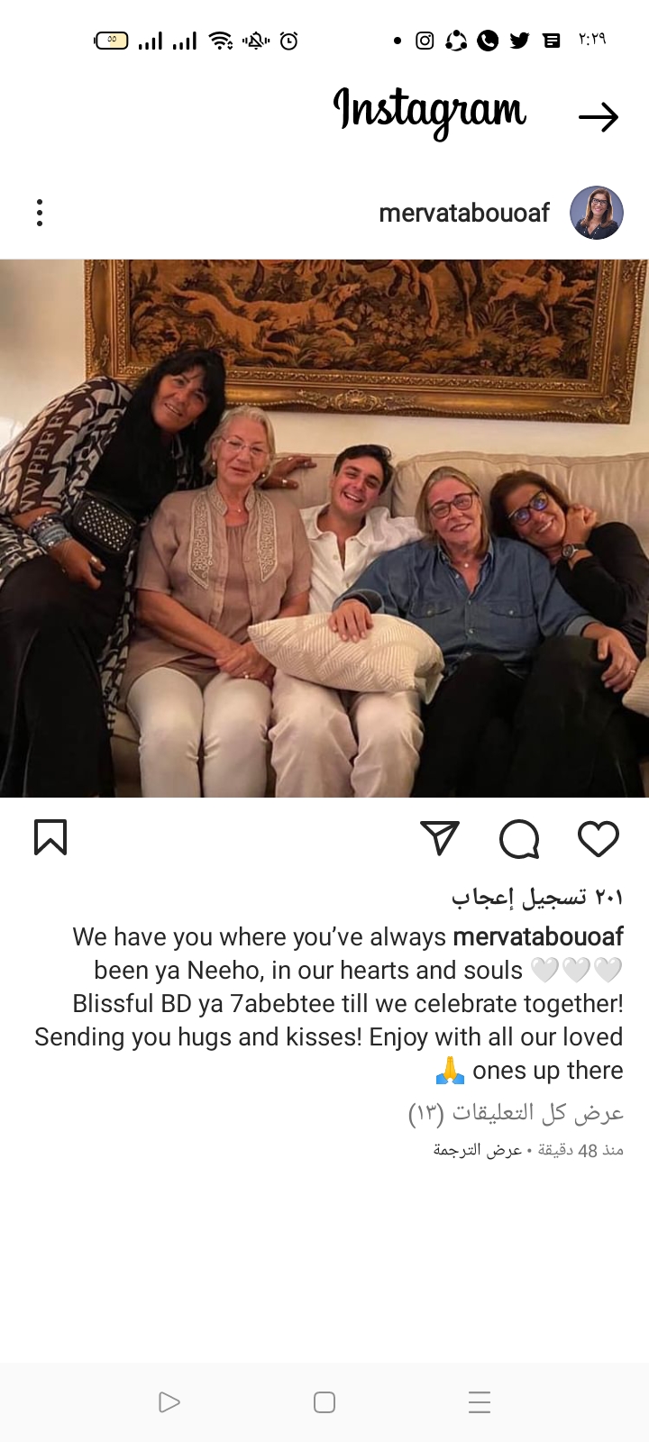 وشاركت ميرفت أبو عوف، متابعيها بصورة عائلة جمعتها بالفنانة مها أبو عوف، عبر حسابها الشخصي بموقع إنستجرام، وعلقت عليها قائلة: ستظل دائما في قلوبنا وأرواحنا يا حبيبتي حتى نحتفل معًا! أرسل لك العناق والقبلات! استمتعي مع جميع أحبائنا هناك.