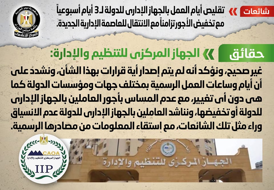 وتواصل المركز الإعلامي لمجلس الوزراء مع الجهاز المركزي للتنظيم والإدارة، والذي نفى تلك الأنباء، مُؤكدًا أنه لا صحة لتقليص أيام العمل بالجهاز الإداري للدولة لـ 3 أيام أسبوعيًا أو تخفيض الأجور تزامنًا مع الانتقال للعاصمة الإدارية الجديدة، وأنه لم يتم إصدار أي قرارات بهذا الشأن.