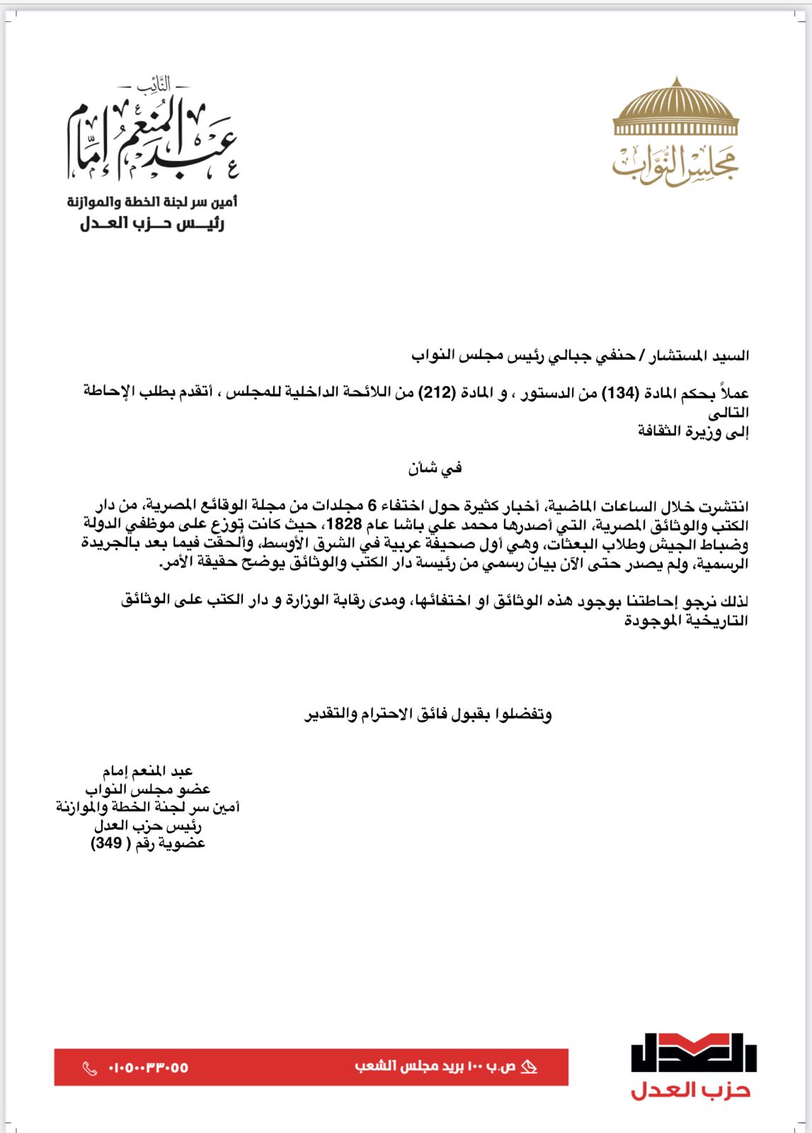 وأضاف النائب: كانت توزع على موظفي الدولة وضباط الجيش وطلاب البعثات، وهي أول صحيفة عربية في الشرق الأوسط، وأُلحقت فيما بعد بالجريدة الرسمية، ولم يصدر حتى الآن بيان رسمي من رئيس دار الكتب والوثائق يوضح حقيقة الأمر.