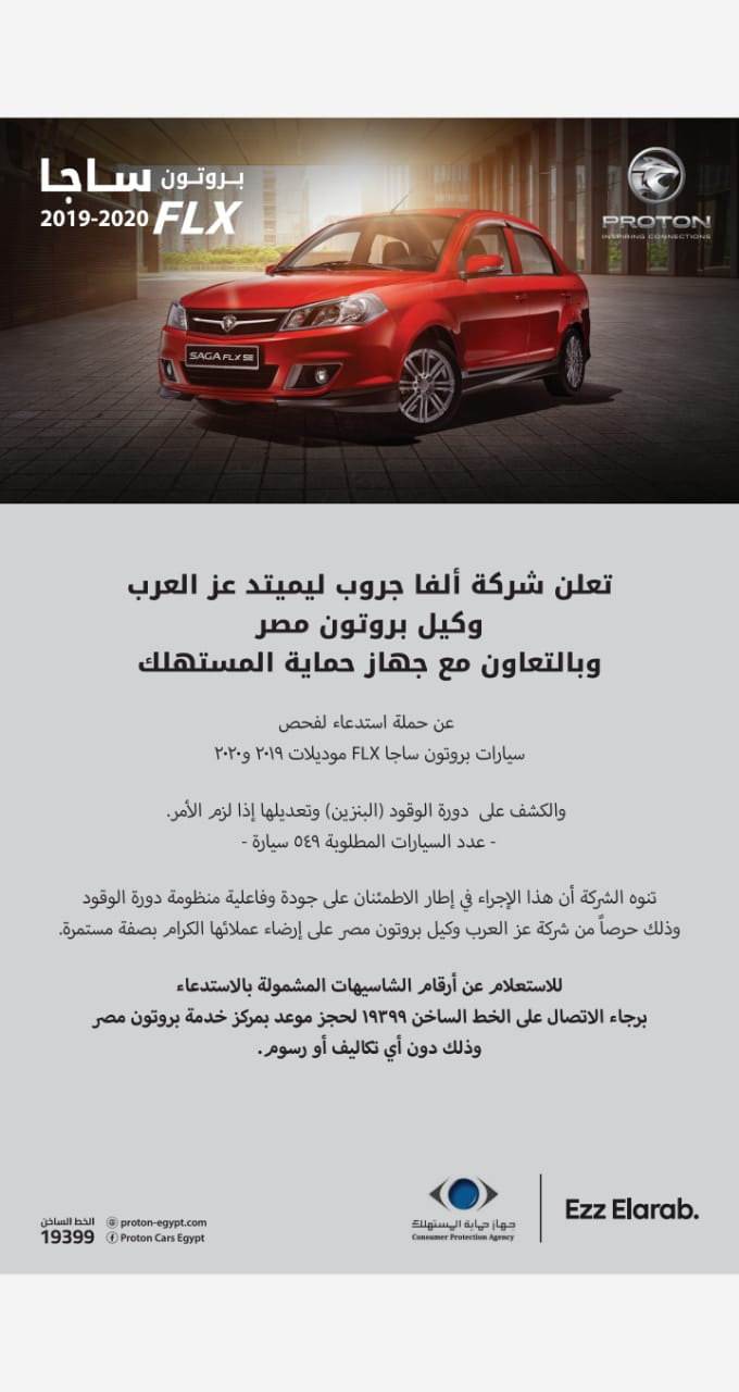 أعلن جهاز حماية المستهلك، حملة استدعاء لفحص سيارات بروتون ساجا FLX موديلات 2019 - 2020 للكشف علي دورة الوقود «البنزين» وتعديلها إذا لزم الأمر، وذلك بالتعاون مع شركة «شركة ألفا جروب ليميتد عز العرب - وكيل بروتون في مصر».