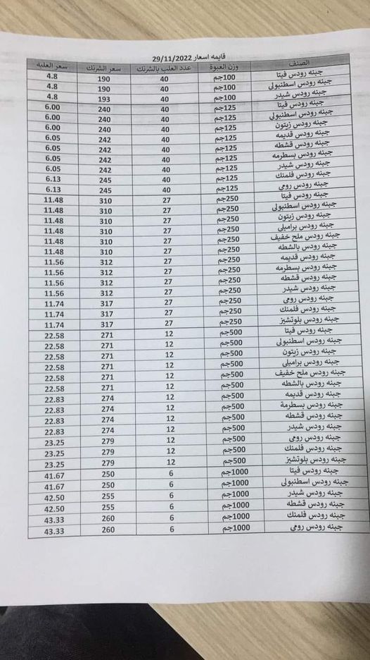 بحسب مستند حصل القاهرة 24 على نسخة منه، مرسل إلى التجار أعضاء الغرف التجارية، ارتفع سعر جبنة رودس ربع كيلو 250 جرام إلى مستوى 11.48 جنيه لطعم جبنة فيتا واسطنبولي وزيتون وبراميلي وملح خفيف ورودس شطة.