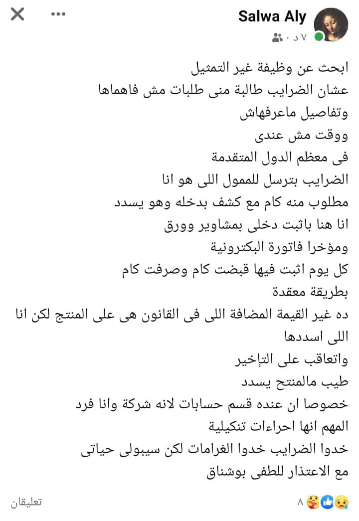 وكتبت سلوى محمد علي، عبر حسابها الشخصي بموقع فيس بوك: أبحث عن وظيفة غير التمثيل علشان الضرائب طالبة مني طلبات مش فاهماها وتفاصيل ماعرفهاش ووقت مش عندي، في معظم الدول المتقدمة الضرائب بترسل للممول اللي هو أنا مطلوب منه كام مع كشف بداخله وهو يسدد.