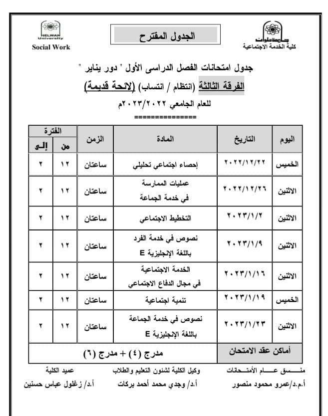 ننشر جداول امتحانات الترم الأول المقترحة لطلاب خدمة اجتماعية جامعة حلوان| صور
