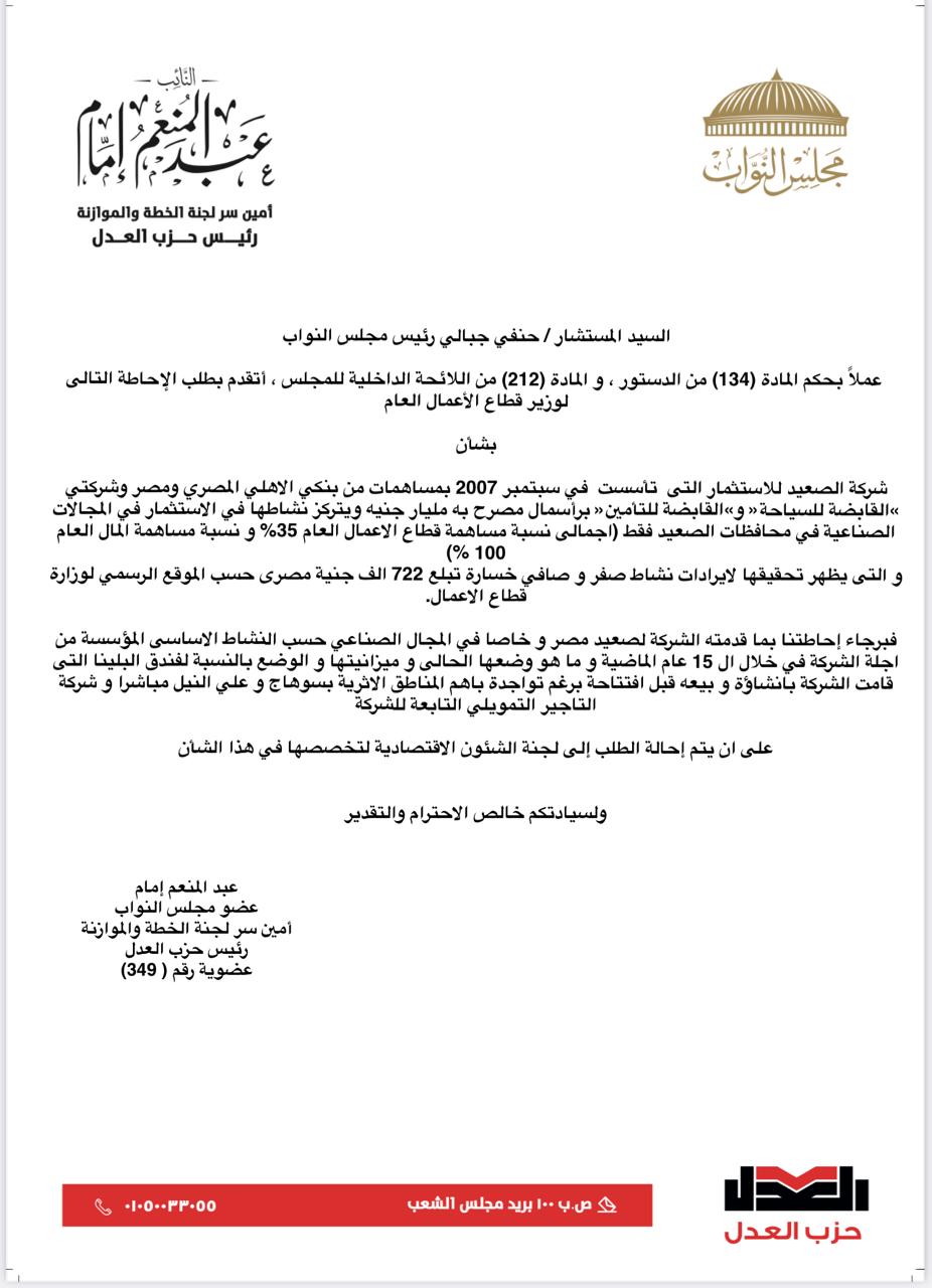 تقدم برلماني بـ مجلس النواب، بطلب إحاطة للمستشار حنفي جبالي رئيس مجلس النواب، موجه لوزير قطاع الأعمال العام بشأن ما قدمته شركة الصعيد للاستثمار لصعيد مصر، خاصة في المجال الصناعي.