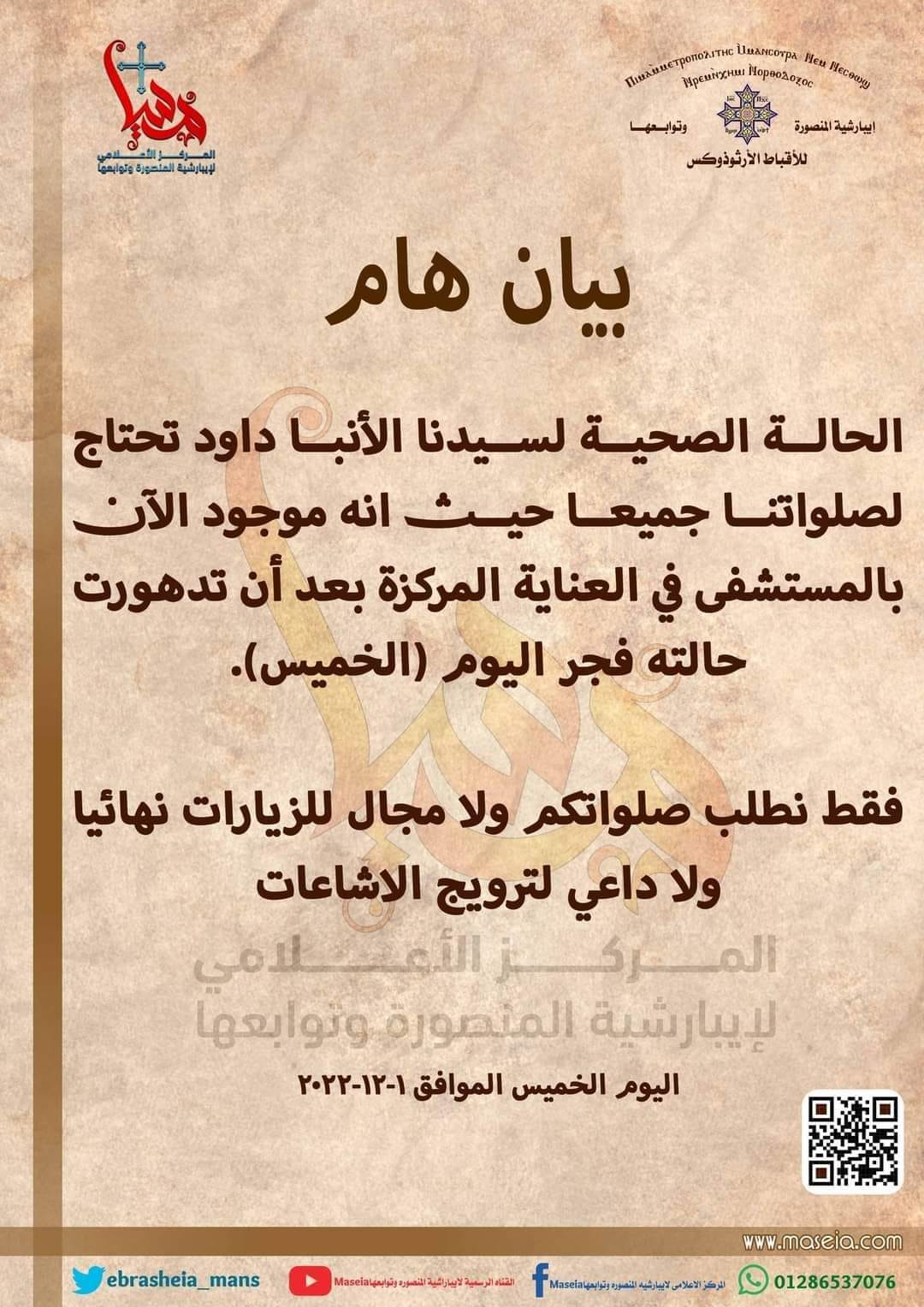 وقالت إيباريشية المنصورة في بيانها: الحالة الصحية لسيدنا الأنبا داود تحتاج لصلواتنا جميعا، حيث إنه موجود الآن بالمستشفى في العناية المركزة بعد أن تدهورت حالته فجر اليوم الخميس.