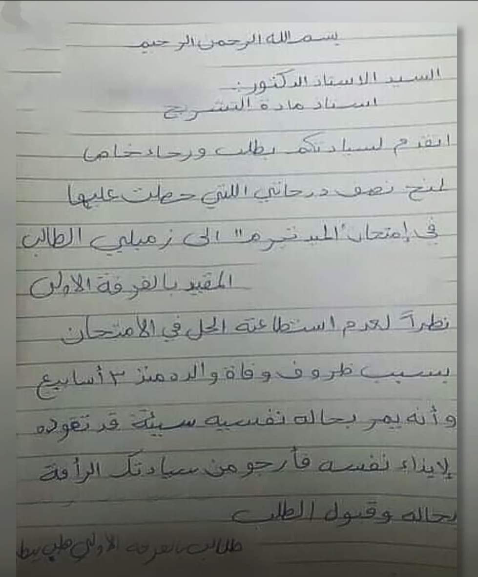 كتب طالب بالفرقة الأولى كلية طب بيطري كما تبين في الرسالة: السيد الدكتور أستاذ مادة التشريح، أتقدم لسيادتكم بطلب ورجاء خاص لمنح نصف درجاتي التي حصلت عليها في امتحان الميدترم إلى زميلي المقيد بالفرقة الأولى.