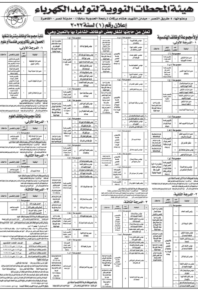 وحددت هيئة المحطات النووية لتوليد الكهرباء التخصصات المطلوبة لشغل وظائف الدرجة الأولى من تخصصات العلوم وفقا للإعلان رقم 1 لسنة 2022 كالآتي:-