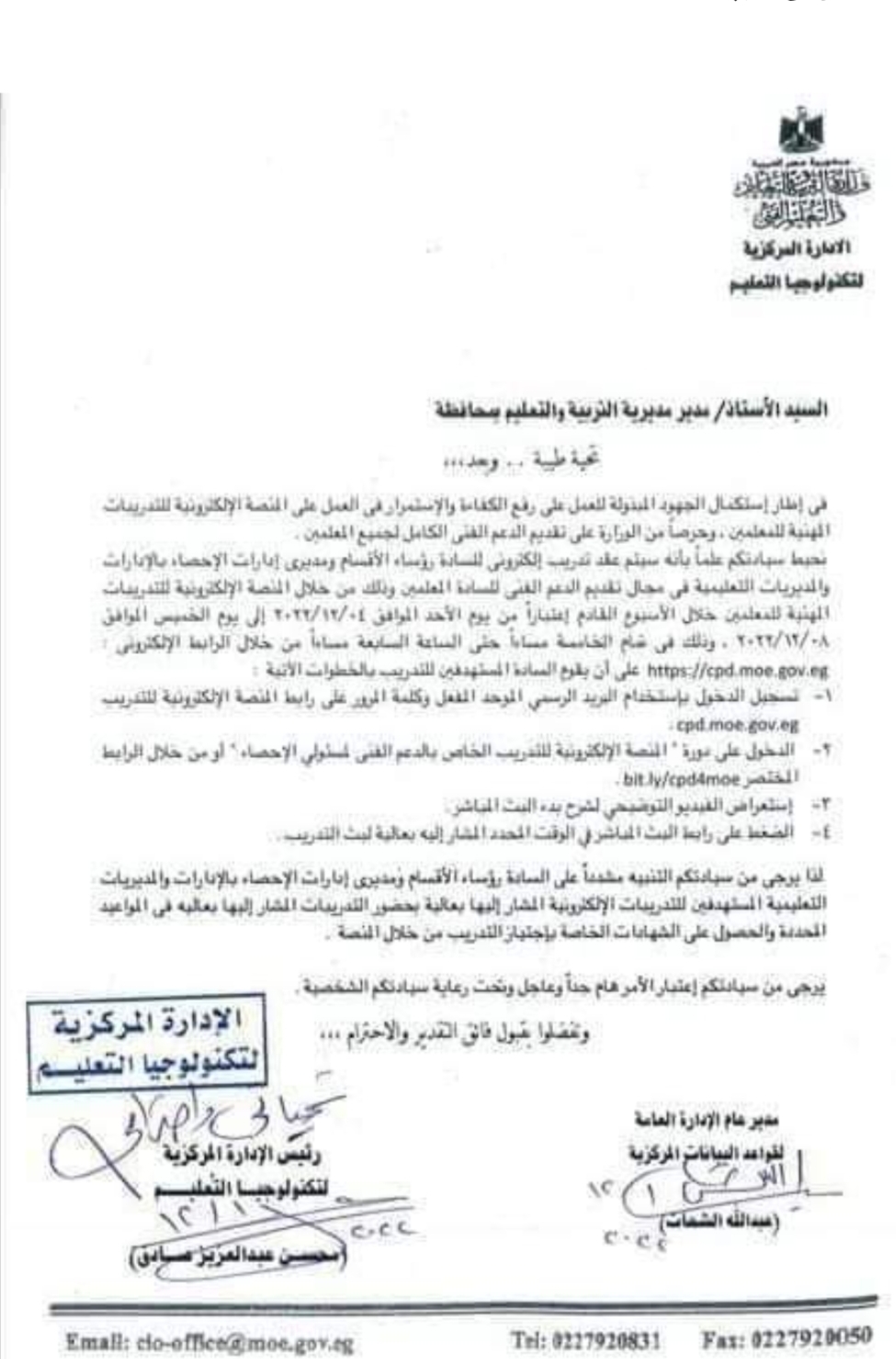 وأشارت وزارة التربية والتعليم، في خطابها، إلى أنه سيتم عقد تدريب إلكتروني لرؤساء الأقسام ومديري إدارات الإحصاء في مجال الدعم الفني للمعلمين، وذلك من خلال المنصة الإلكترونية للتدريبات خلال الأسبوع الجاري بداية من يوم الأحد الموافق 4 ديسمبر 2022 حتى يوم الخميس 8 ديسمبر الجاري، على أن يتبع المستهدفون للتدريب الخطوات التالية: