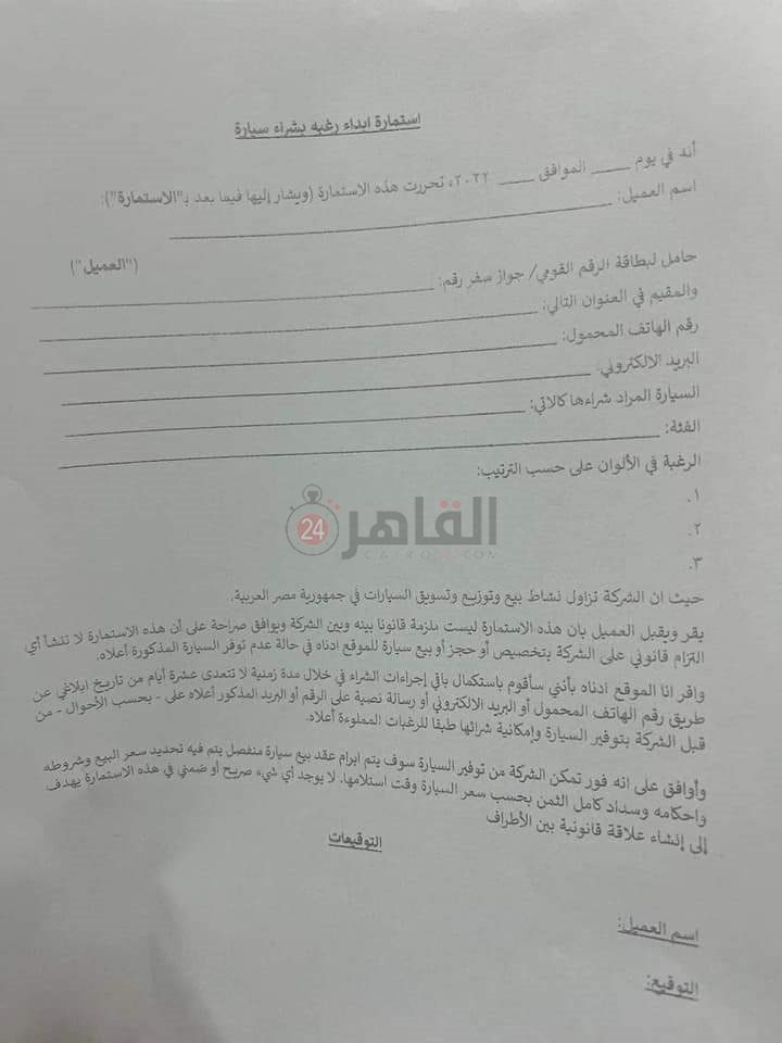 وتابعت: يقر ويقبل العميل بأن هذه الاستمارة ليست ملزمة قانونًا بينه وبين الشركة، ويوافق صراحة على أن هذه الاستمارة لا تنشأ أي التزام قانوني على الشركة بتخصيص أو حجز أو بيع سيارة للموقع أدناه في حالة عدم توفر السيارة المذكورة أعلاه.