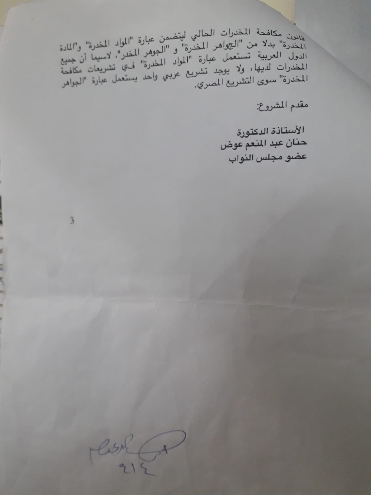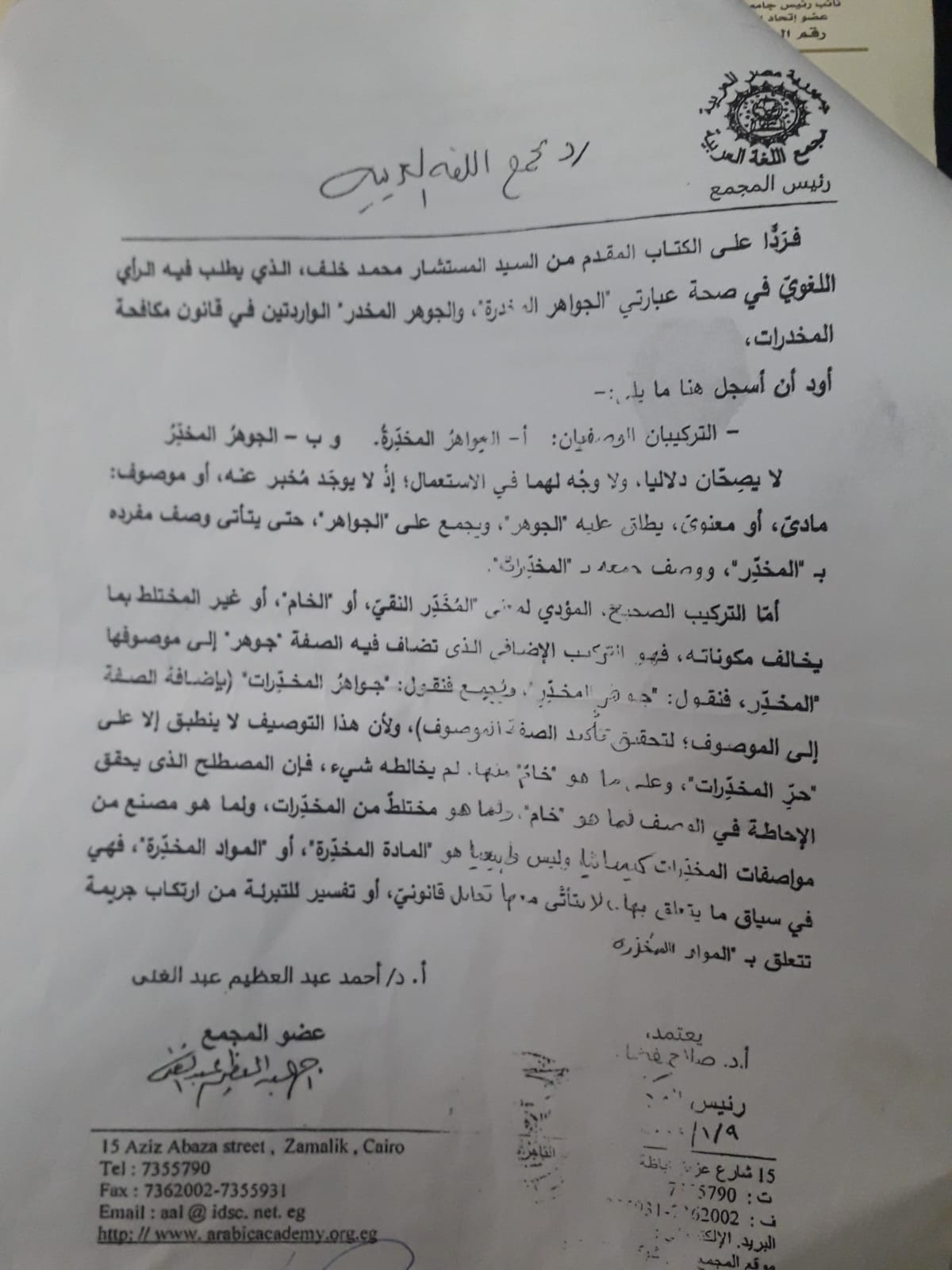 بينما جاءت المذكرة الإيضاحية للقانون، أنه منذ مطلع القرن الماضي؛ تطلق قوانين مكافحة المخدرات المتعاقبة، ومنها القانون الحالي على مسمى الجواهر المخدرة، وقد لاحظ المستشار محمد محمود خاف وكيل هيئة قضايا الدولة، أن عبارة «الجواهر المخدرة» خاطئة من الناحية اللغوية، ويجب أن تستعمل بدلًا منها عبارة المواد المخدرة، وأرسل بحثه في هذا الشأن إلى مجمع اللغة العربية.