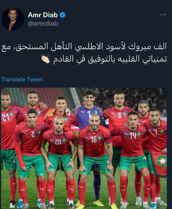 حرص الفنان عمرو دياب على تهنئة المنتخب المغربي، بعد فوزه على نظيره الإسباني في الدور الـ16 لكأس العالم 2022 وصعوده لأول مرة لدور الثمانية.