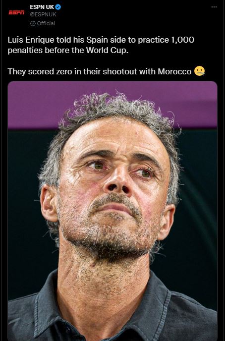 سخرت شبكة ESPN العالمية من لويس إنريكي مدرب منتخب إسبانيا، وذلك بعد تصريحاته عن ركلات الترجيح قبل مواجهة المغرب، حيث قالت: لويس إنريكي أعلن أنه درب لاعبيه على تسديد 1000 ركلة جزاء، ولم يسجل أي ركلة ترجيح أمام المنتخب المغربي.