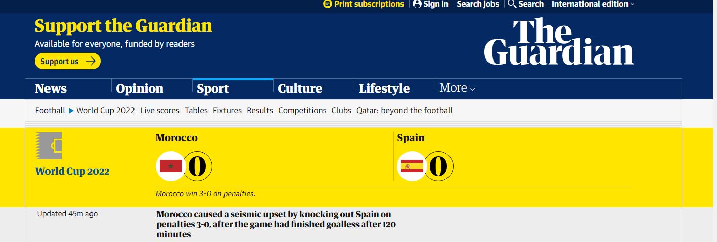 قالت جارديان، إن منتخب المغرب تسبب في زلزال وصدمة قوية لمنتخب إسبانيا، بعد أن تفوق عليه بركلات الترجيح بنتيجة 3-0.