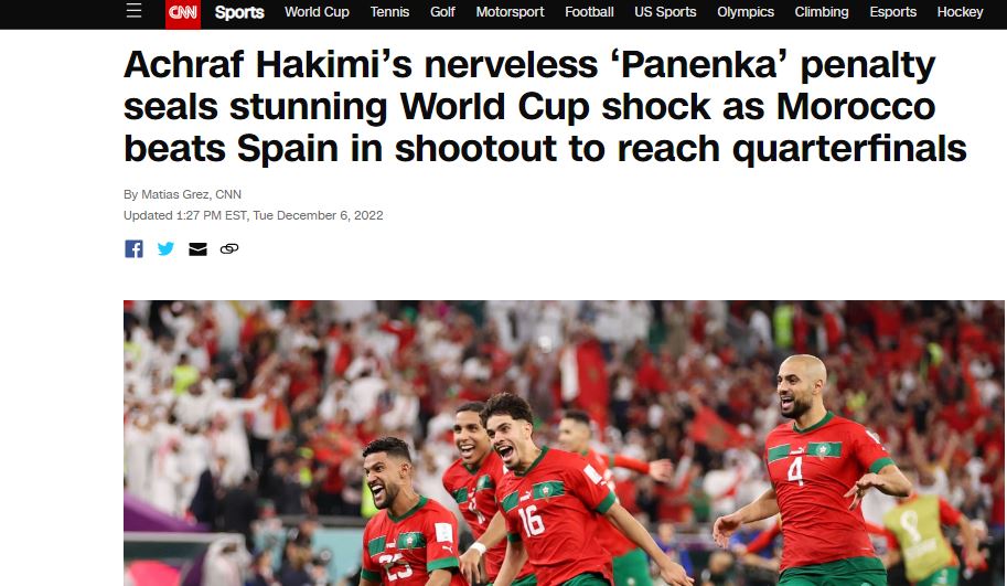أشارت الشبكة في تقريرها إلى أن تسديدة أشرف حكيمي في ركلة الجزاء الأخيرة، كانت بمثابة بوابة العبور المفاجئة لمنتخب المغرب في الصدمة التي حققها بالفوز على إسبانيا.